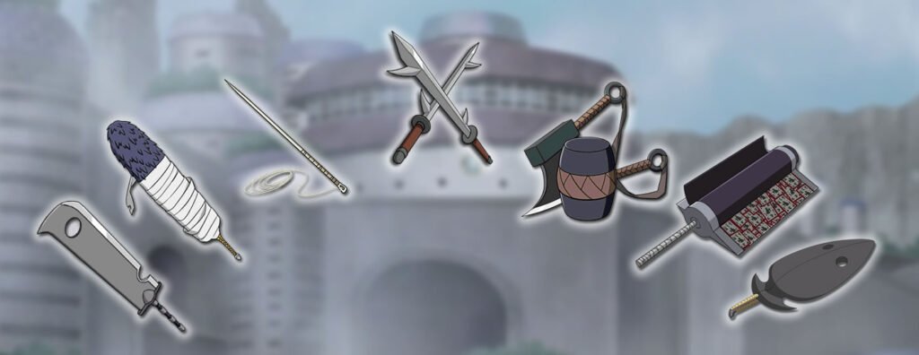 Kiba (牙) significa literalmente “Colmillos”. Son espadas dobles con un gancho en cada lado, al estar imbuidas de chakra de elemento rayo este aumenta su poder de corte. Se dice que son las espadas más afiladas que se han forjado. Esta espada se describe en algunos pergaminos como “Espadas Relámpagos” (雷刀, Raitou).